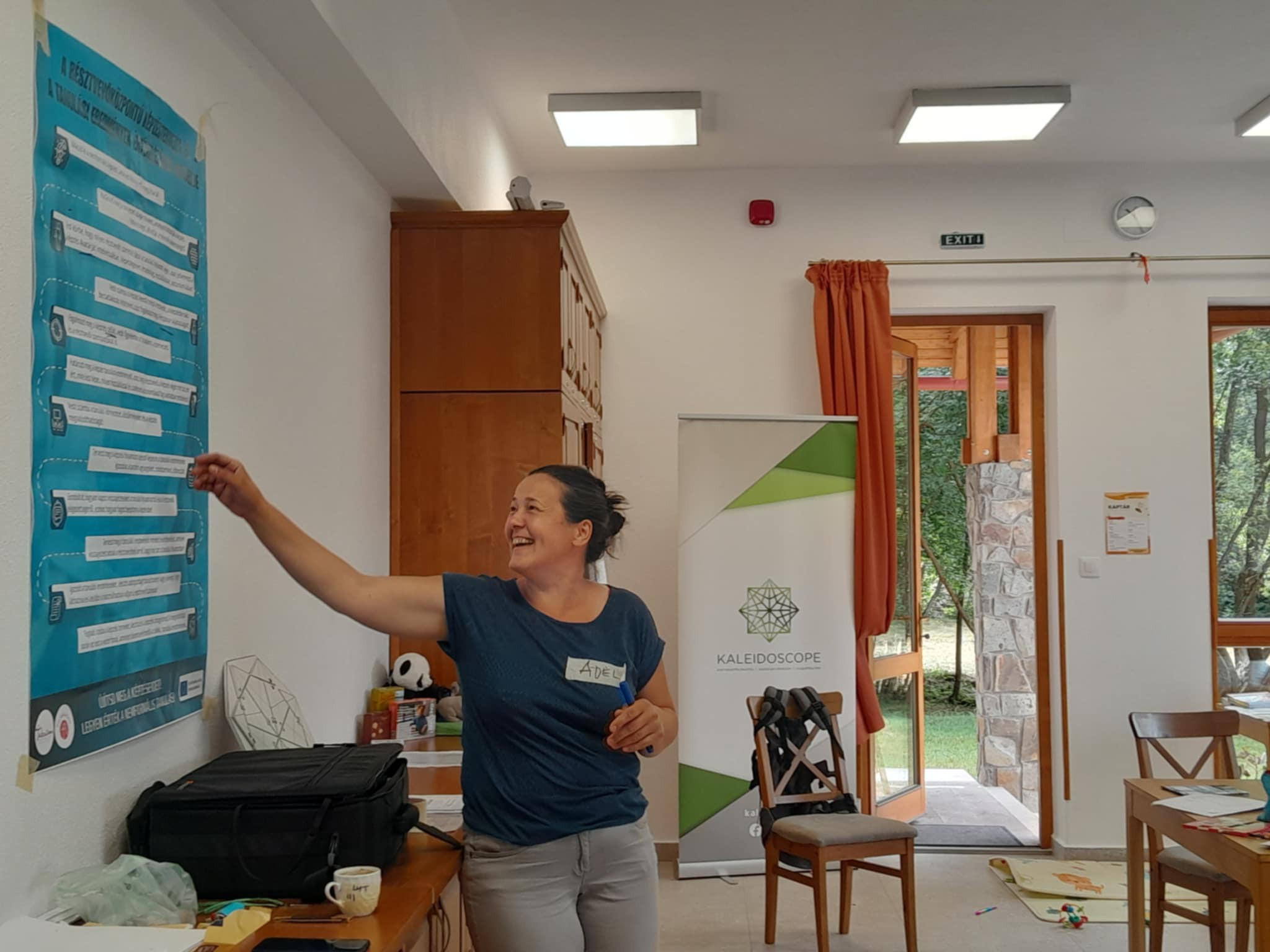 A képzésfejlesztési workshopot Kiss Adél, a Pro Educatione kollégánője vezette. A kiscsoportos munkákban segítette Péter Boglárka egyesületi munkatárs. A projekt során kifejlesztett hasznos képzési anyagunk, a TEA alapú képzésfejlesztés folyamatábrája, melyet szórólap formájában is megjelentettünk, a résztvevőknek is eligazítóként szolgált és megfogalmazhatták és meg is osztották azokat a lépéseket, melyeket saját képzéseik ügyéért hajlandóak megtenni.